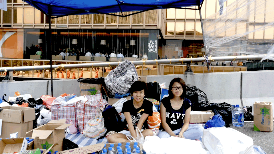 Around noon things were relatively quiet. The city appeared rigidly split between areas where life continued on as normal and territory totally disrupted by the protests. Office workers ate seemingly ordinary lunches at a 2nd floor Fairwood fast food place just a few feet away from a supply tent on a highway overpass. Two women sat among cases of water bottles and canvas bags. I didn't get their names, only their ages, 19 and 21.